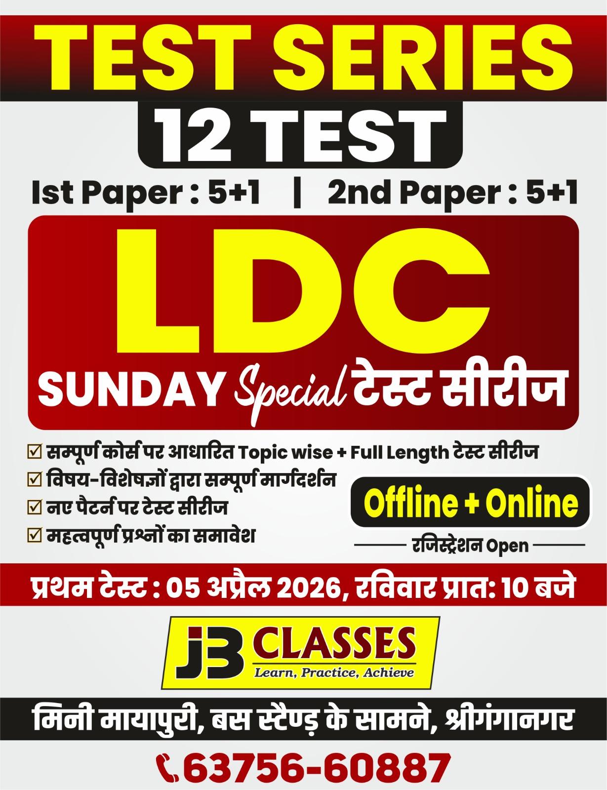 JB Classes द्वारा प्रस्तुत एलडीसी (LDC) के लिए विशेष संडे टेस्ट सीरीज। इस सीरीज में कुल 12 टेस्ट शामिल हैं, जिसमें प्रत्येक पेपर 5+1 पैटर्न पर आधारित होगा।